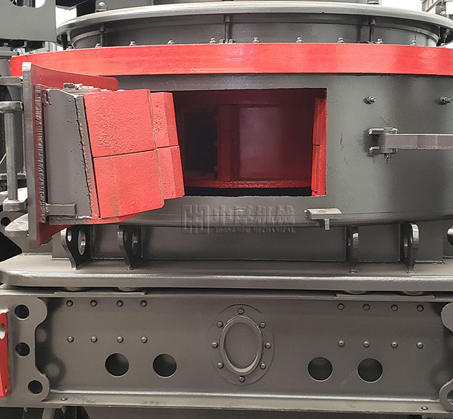 物料由進(jìn)料斗進(jìn)入沖擊式制沙機(jī),經(jīng)分料器將物料分成兩部分,一部分由分料器中間進(jìn)入高速旋轉(zhuǎn)的葉輪中,在葉輪內(nèi)被迅速加速,其加速度可達(dá)數(shù)百倍重力加速度,然后以60-70米/秒的速度從葉輪三個(gè)均布的流道內(nèi)拋射出去,首先同由分料器四周自收落下的一部分物料沖擊破碎,然后一起沖擊到渦支腔內(nèi)物料襯層上,被物料襯層反彈,斜向上沖擊到渦動(dòng)腔的頂部,又改變其運(yùn)動(dòng)方向,偏轉(zhuǎn)向下運(yùn)動(dòng),從葉輪流道發(fā)射出來(lái)的物料形成連續(xù)的物料幕。這樣一塊物料在渦動(dòng)破碎腔內(nèi)受到兩次以至多次機(jī)率撞擊、磨擦和研磨破碎作用。被破碎的物料由下部排料口排出。在整下破碎過(guò)程中,物料相互自行沖擊破碎,不與金屬元件直接接觸,而是與物料襯層發(fā)生沖擊、摩擦而粉碎,延長(zhǎng)機(jī)械磨損時(shí)間。渦動(dòng)腔內(nèi)部巧妙的氣流自循環(huán),消除了粉塵污染。